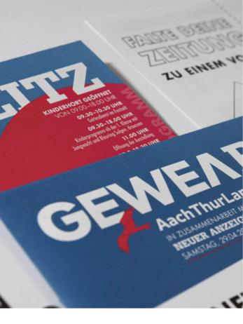 Alle fünf Jahre stellt das Gewerbe AachThurLand seine Produkte und Dienstleistungen an der Gewerbeausstellung GEWEA vor. Für die GEWEA 2017 hatte uns der Gewerbeverband mehrere konzeptionelle Aufgaben anvertraut. Zusätzlich zur gestalterischen Umsetzung und des Drucks der Werbematerialien (Logo, Plakate, Flyer, Messezeitung, Signaletik) haben wir auch die Kommunikation auf Social Media übernommen.