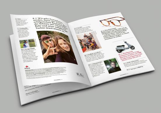 Geschichten aus dem Leben bilden den Fokus des Kundenmagazins des Schweizer Lebensversicherungskonzerns Swiss Life. Das hochwertige Magazin erscheint dreimal jährlich. Die medienwerkstatt ist zuständig für Sprachadaptionen ins bestehende Layout, die Bildbearbeitung und den Druck.
